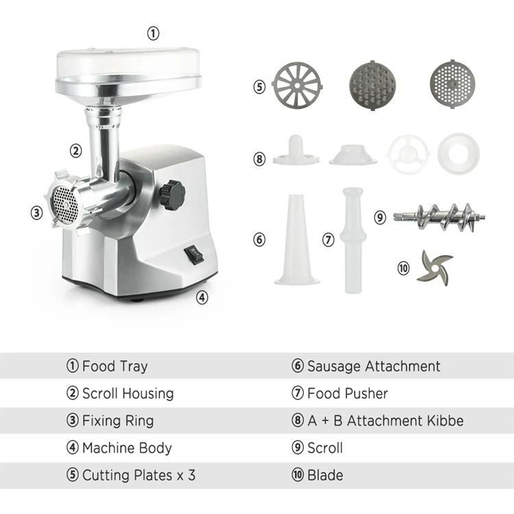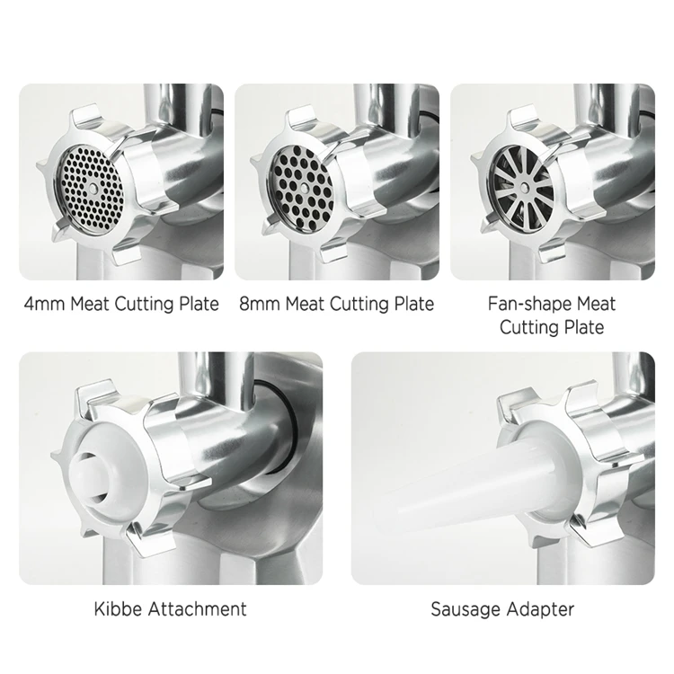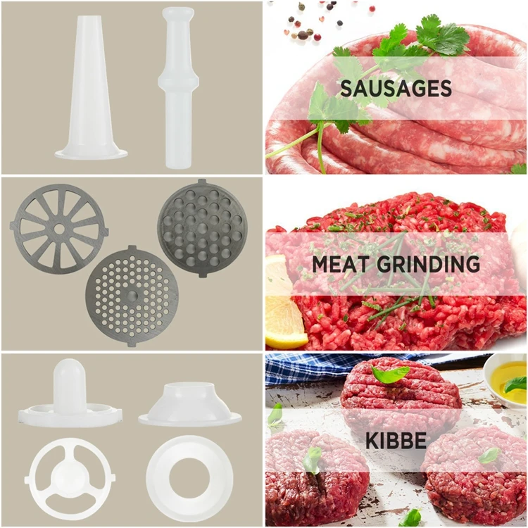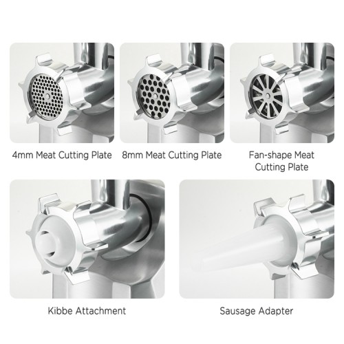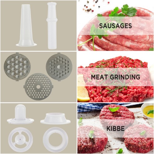 sausage & kibbe attachment with food pusher; 3PCS metal cutting blades (4, 8, fan shape) Larger capacity metal tray (24.5*19.5cm)