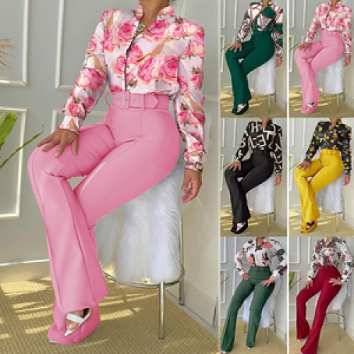 Name | Fuyu Morden Style Women Printed Long Sleeve Top and Solid Color Pants Set with Belt Ladies Casual Fall Clothing |