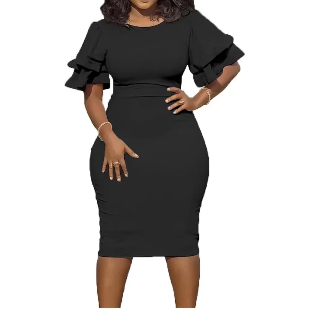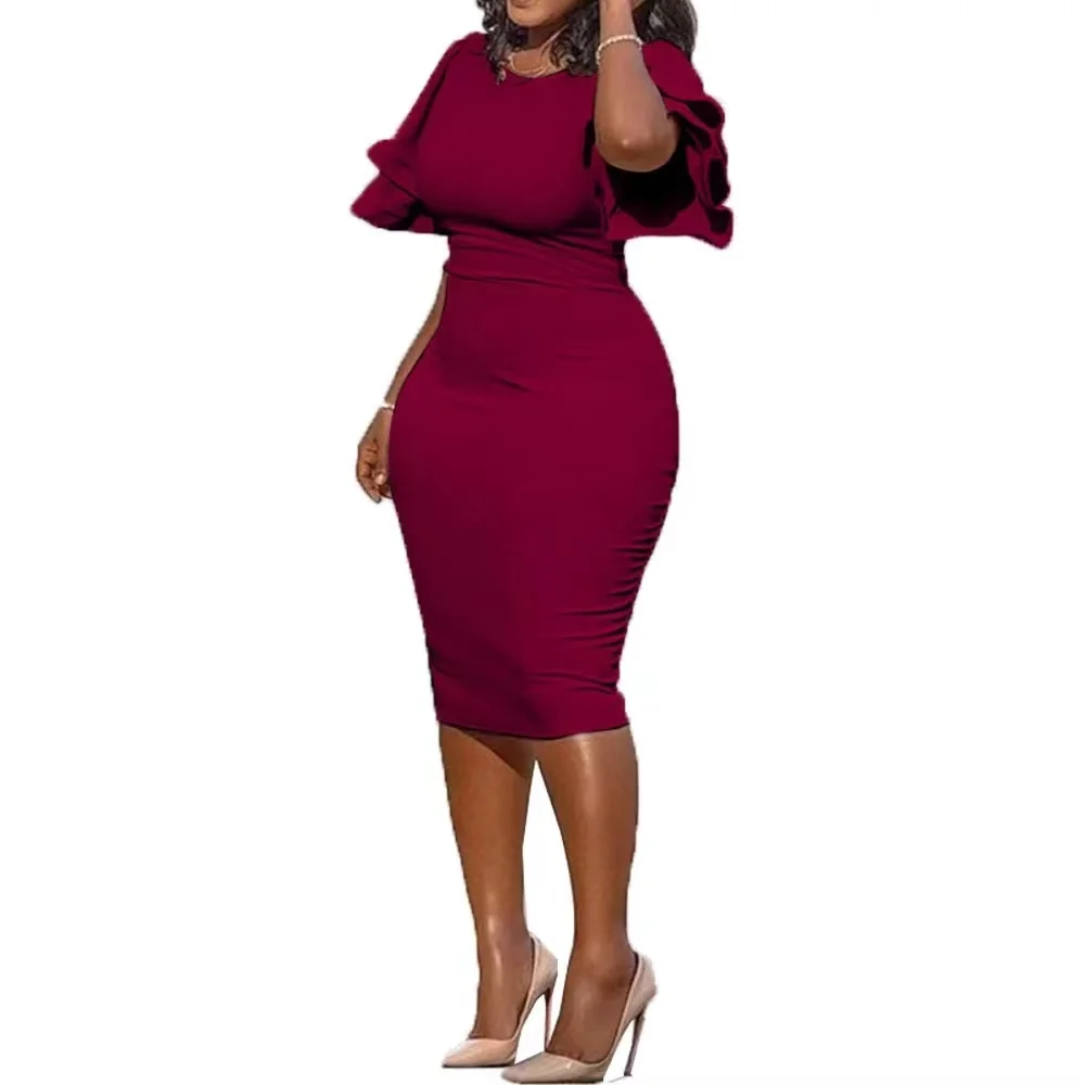 High Quality Ruffles Sleeves Solid Color Elegance Oversized Formal Office Dress Slim Fit Skirt Plus Size Women's Clothing