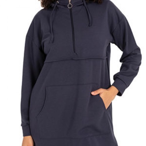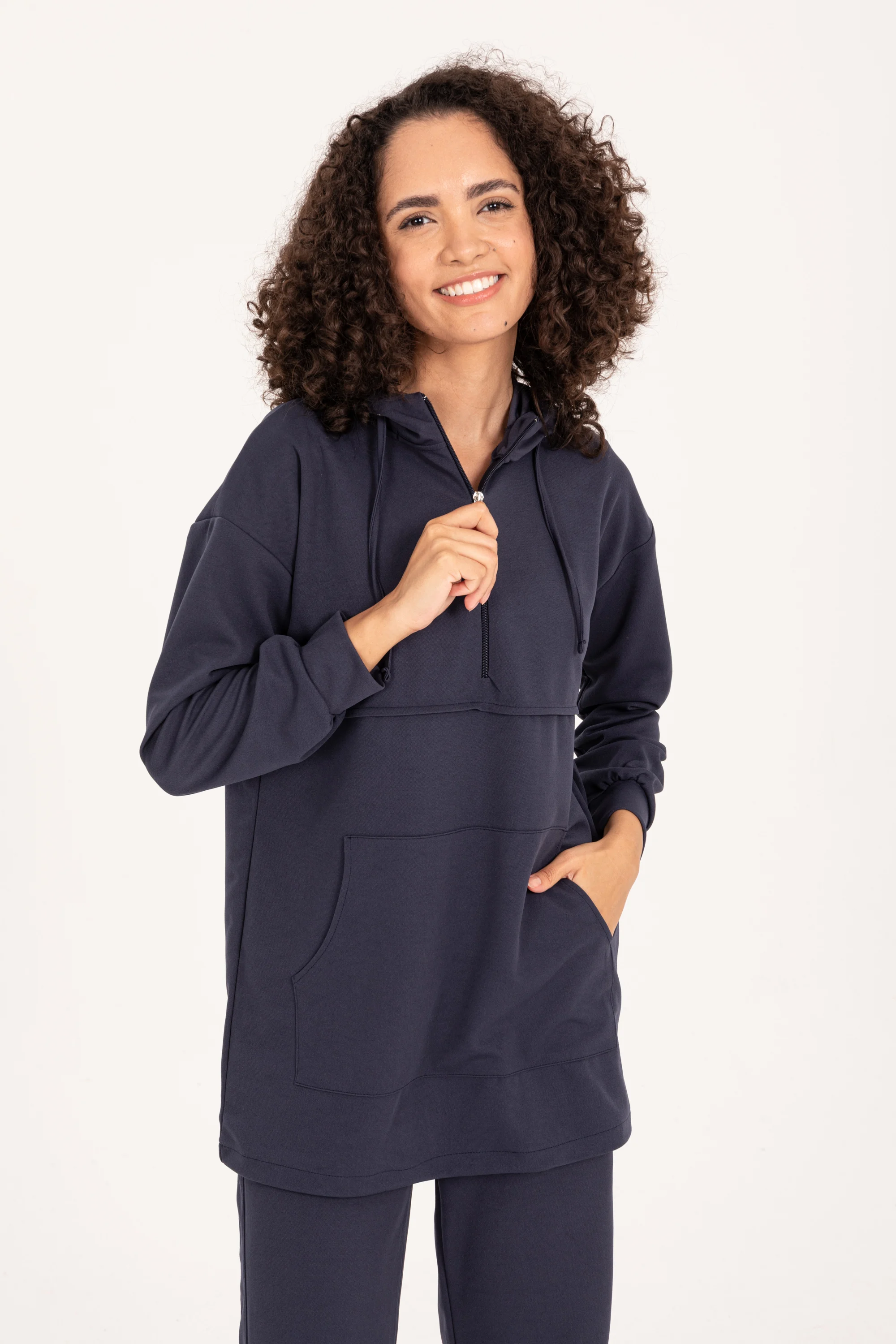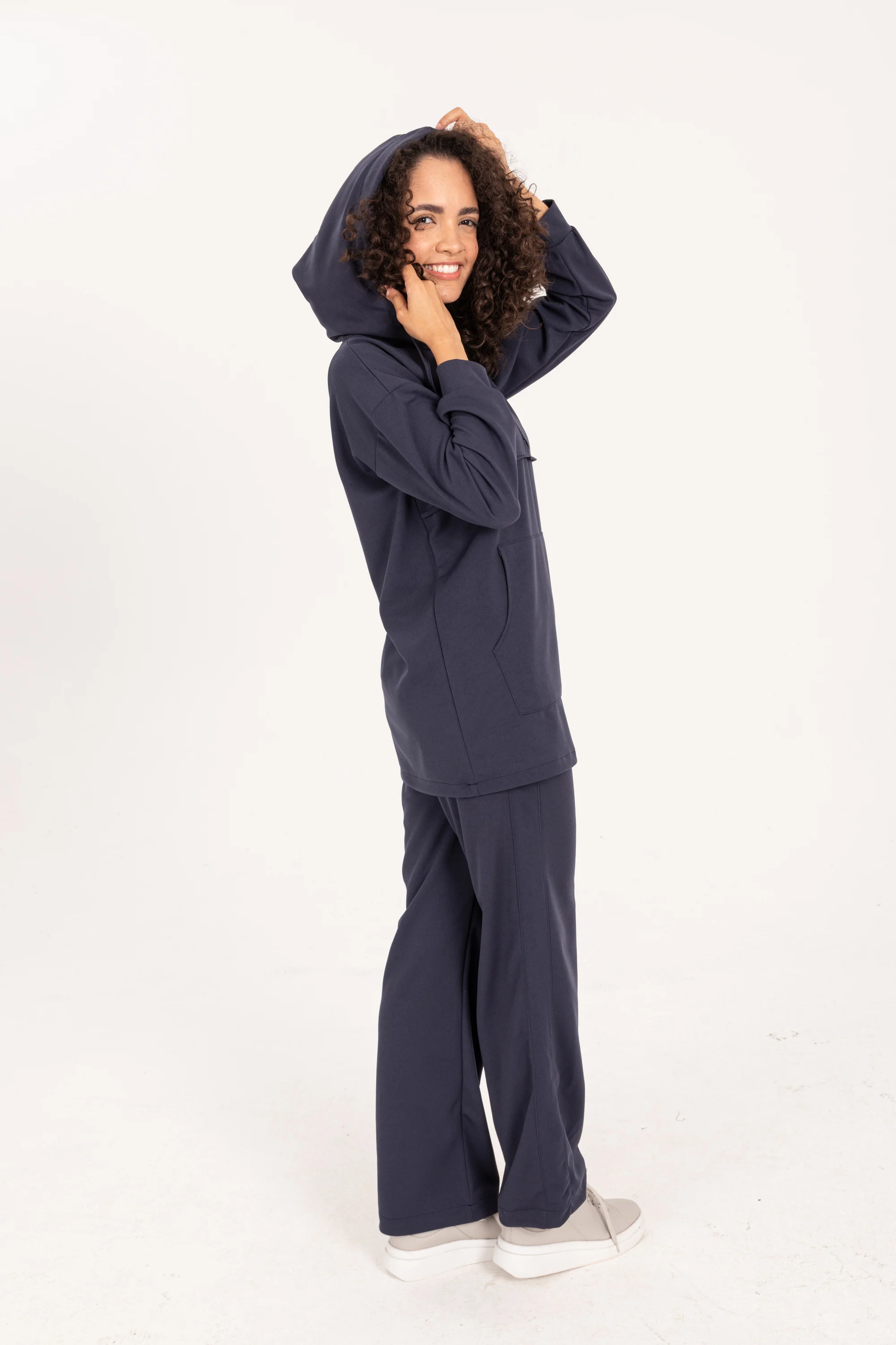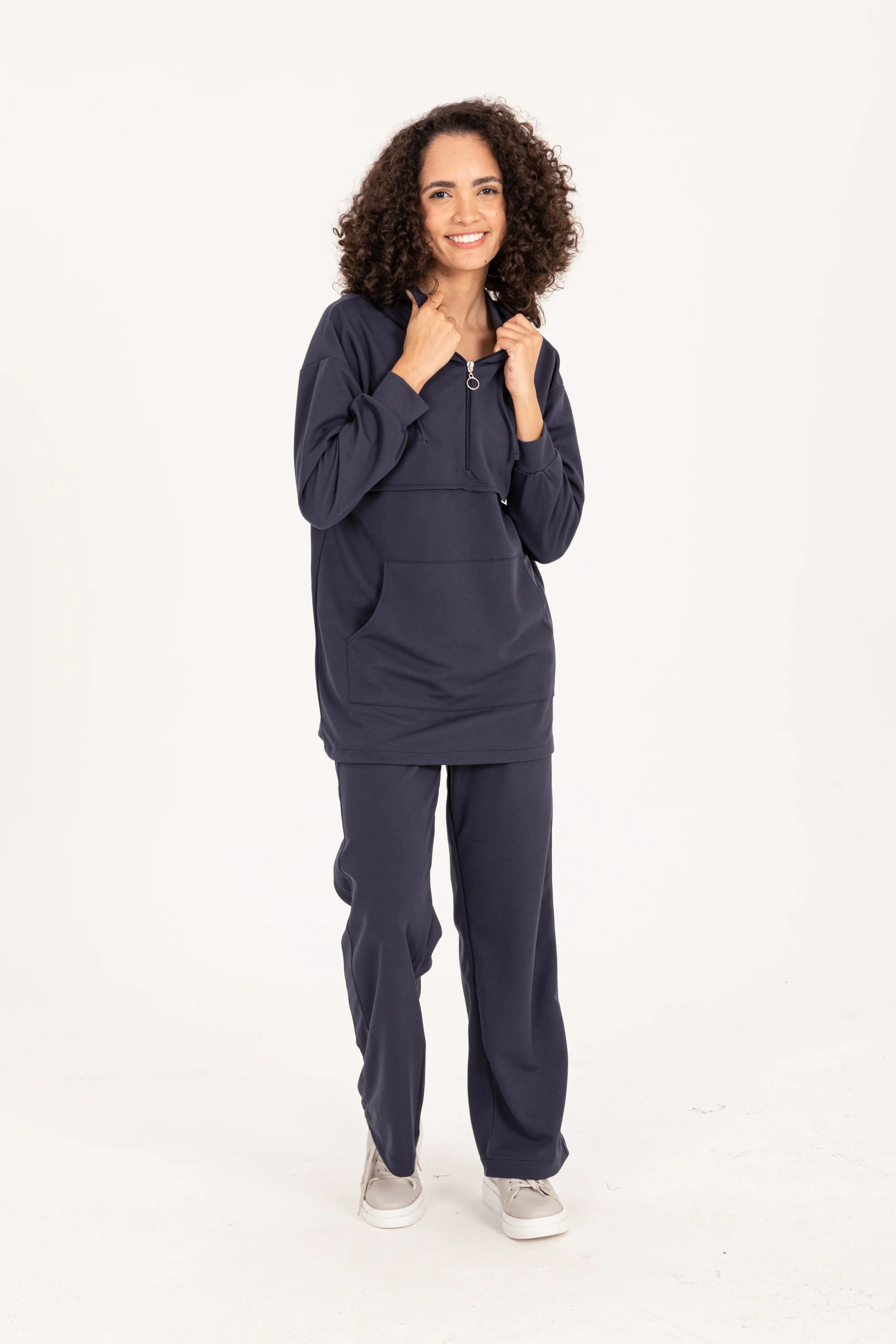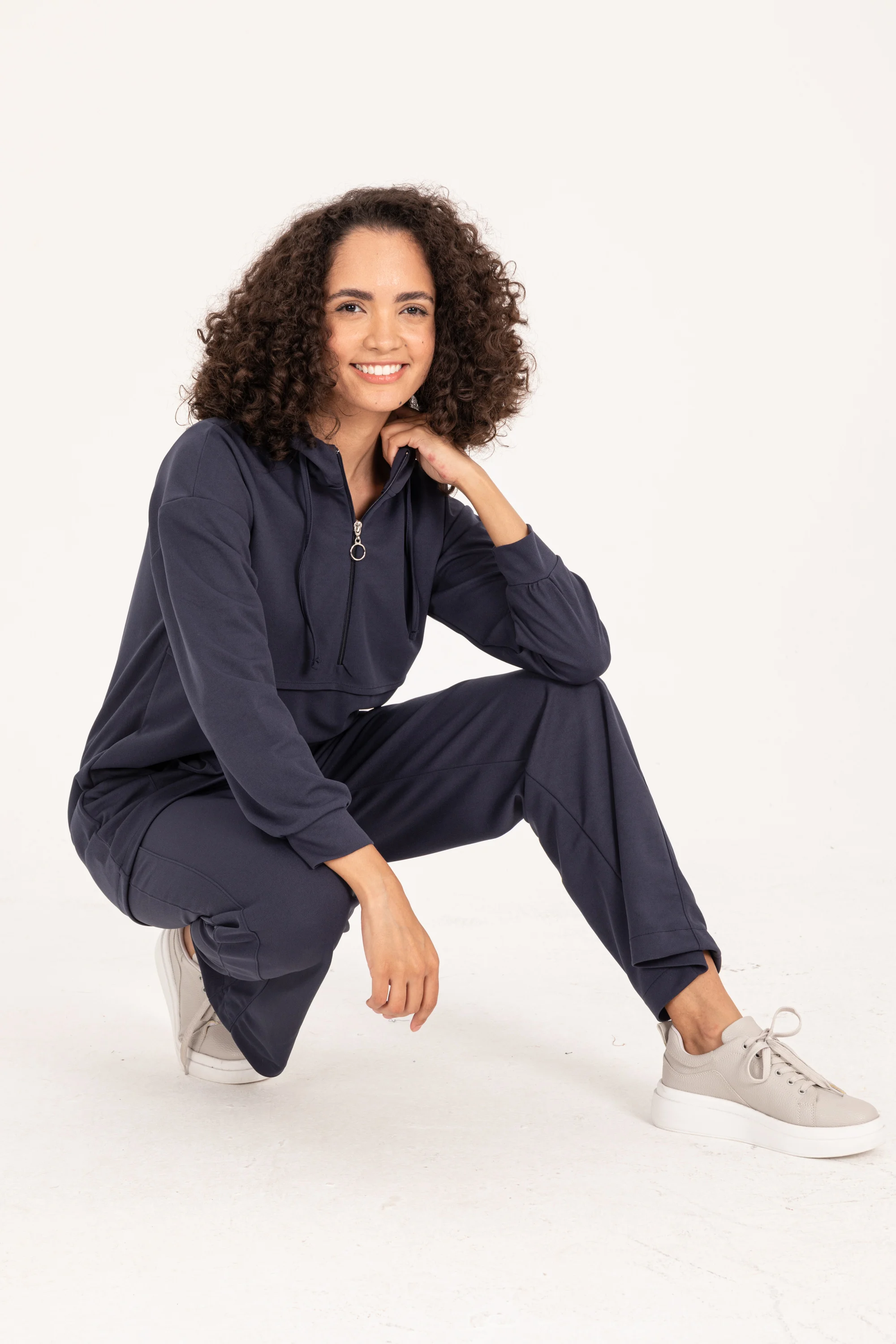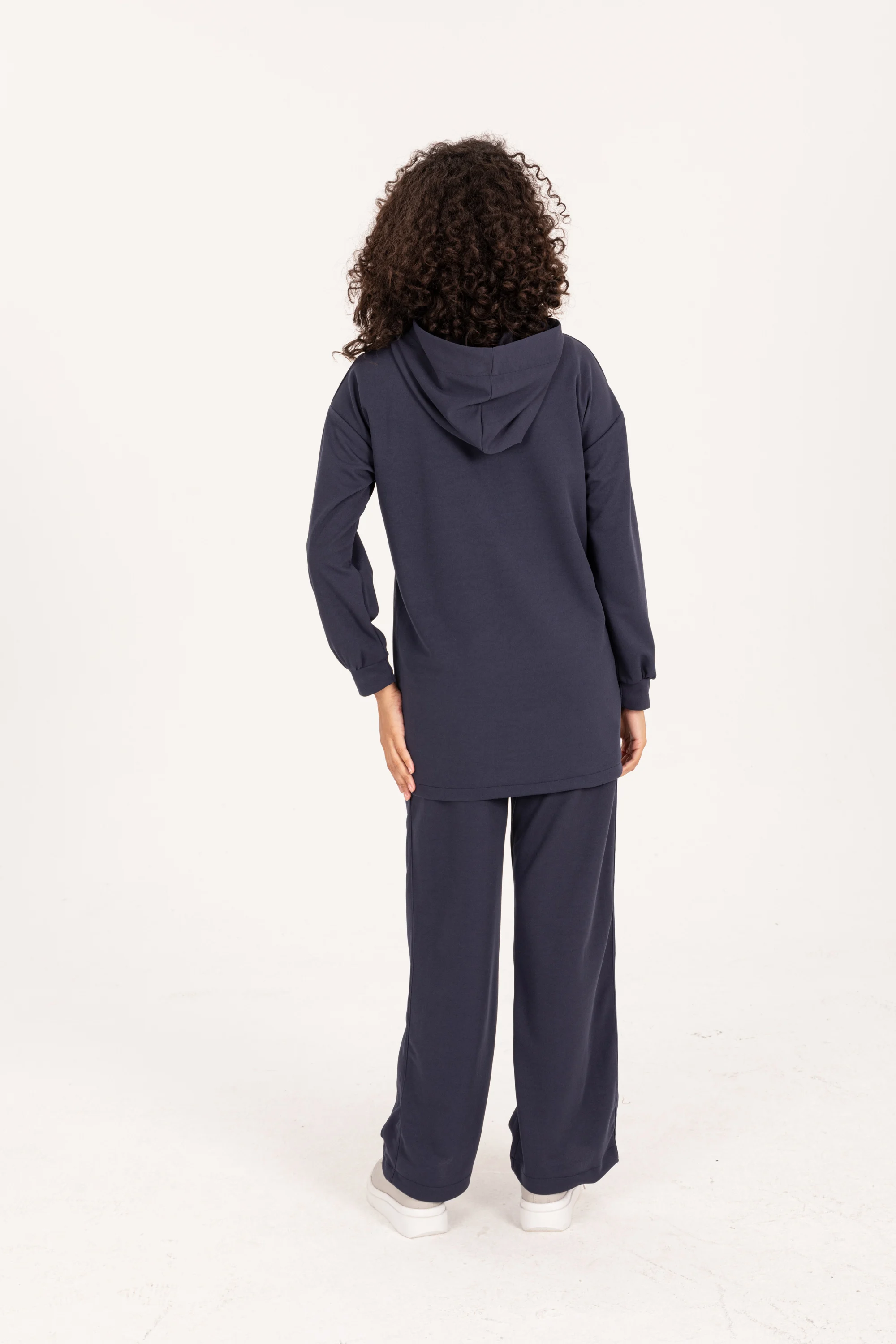 HIGH QUALITY HOODED AND ZIPPERED KNITTED NAVY BLUE TWO PIECE WHOLESALE WOMEN'S SET
